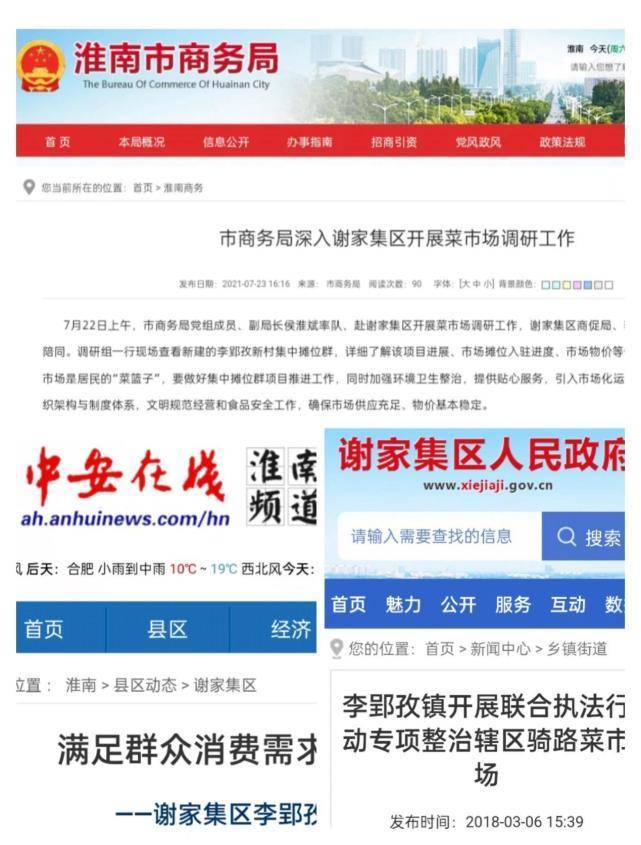 2021年07月23日淮南市商务局官网报道,“7月22日上午,市商务局党组成员、副局长侯淮斌率队,赴谢家集区开展菜市场调研工作,谢家集区商促局、李郢孜镇政府相关负责人陪同。调研组一行现场查看新建的李郢孜新村集中摊位群,详细了解该项目进展、市场摊位入驻进度、市场物价等情况。调研组指出,农贸市场是居民的“菜篮子”,要做好集中摊位群项目推进工作。”