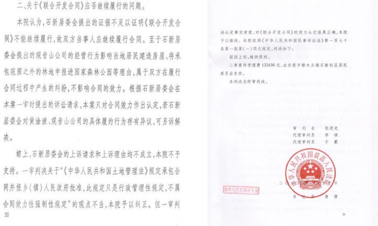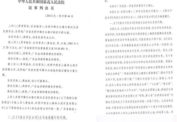 可樟木头镇政府又曾于 2010 年 2 月 1 日根据 2009 年 4 月 8日党政班子联席会议的决定,指示石新居委会(合同主体方)再行通过诉讼方式收回公园范围内所有的土地、建筑物、观光旅游设施及经营权。案件一审广东省高院判决黄淦波与石新居委会所签《联合开发合同》、《协议书》为有效合同应继续履行。原告石新居委会不服判决提起上诉,二审由最高人民法院判决驳回上诉