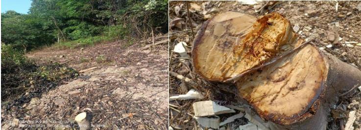 典型案例一:2009 年石新社区主任蔡树生,擅自在公园内砍伐近 6 亩森林,占用林地约 4000 ㎡兴建了两栋大别墅,后因山体滑坡被搁置。至今东莞市、樟木头镇政府及职能部门包庇犯罪不作处理。