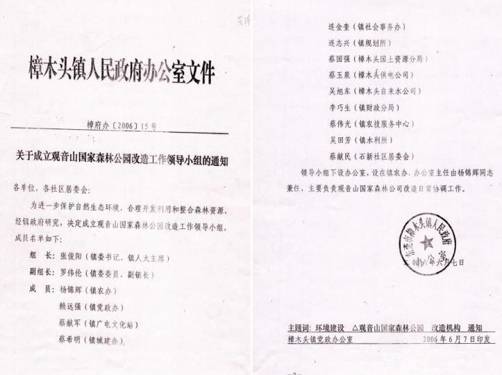 2005 年 12 月 23 日,国家林业局正式批准设立广东观音山国家森林公园。2006 年 6 月 7 日,东莞市樟木头镇政府就公开对抗国家林业局批文,即下发樟府办[2006]15 号《关于成立观音山国家森林公园改造工作领导小组的通知》,宣布成立专门的领导班子,主要负责观音山国家森林公园变更经营方式工作。