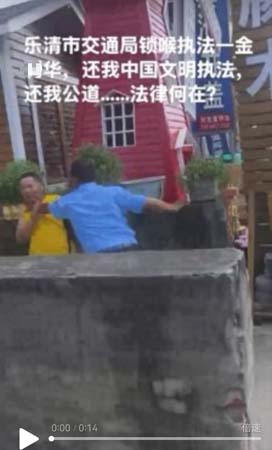 温州再现“锁喉执法”致一民企负责人受 公平正义,国之基址。近日,浙江省温州市乐清市一民营企业负责人王某辉致函有关部门,反映因当地交通综合执法人员锁喉执法给其造成轻微伤,至今三个多月没有得到公正解决的问...