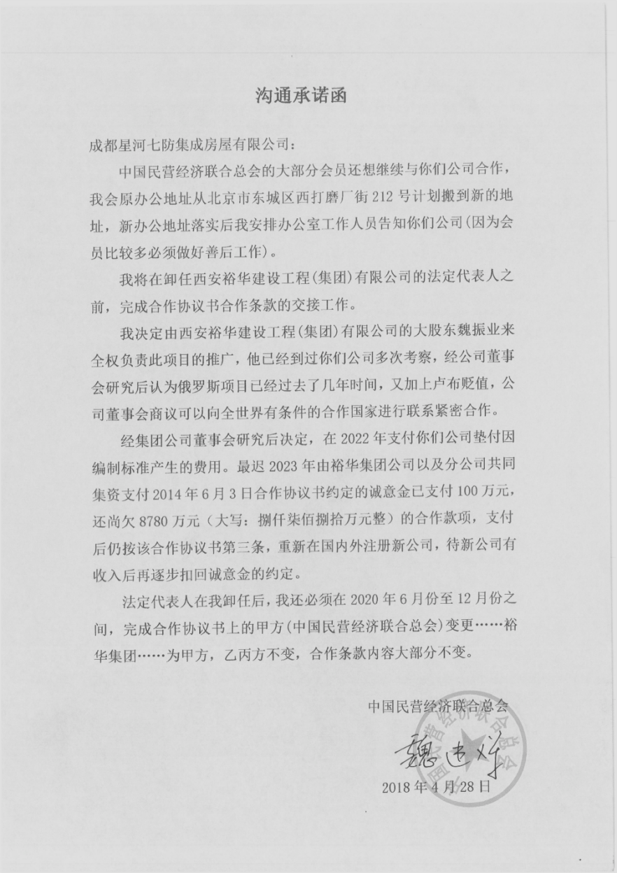 根据2016年1月12日甲乙丙三方(甲方:中国民营经济联合总会,魏建辉会长;乙方:科斯特洛马州木材加工厂俄方代表,阿列克马耶夫.帕.弗;丙方:成都星河七防集成房屋有限公司,法定代表人先东琴)签订了《中俄重大项目合作协议书》。并由西安裕华建设集团注册新公司在国外大发展,具体由魏振业、魏成业全权负责。
